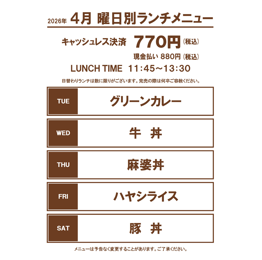 営業時間/11:45〜13:30 店休日/日・月・祝日